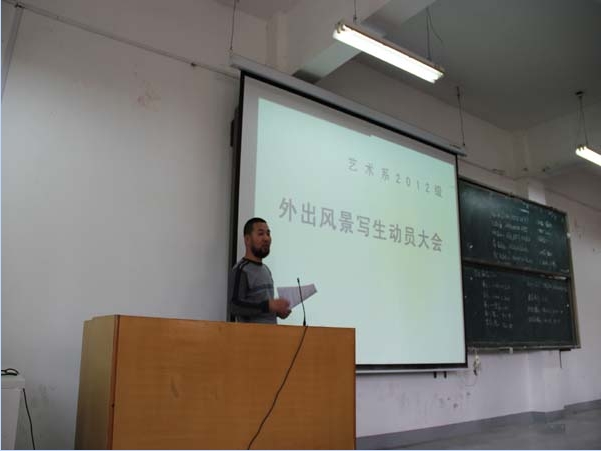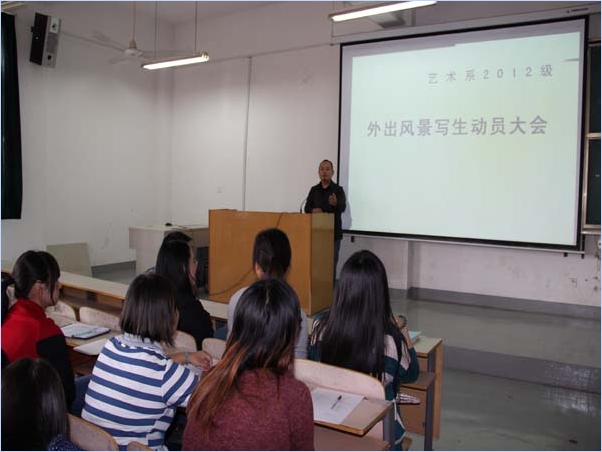 为提高学生的写生能力,10月09日中午,有关艺术系12级学生外出风景写生动员大会在D楼112多媒体召开。常务主任孙义,教学副主任屠秀栋,以及写生带队老师张永、王海峰、胡亚文、苏立超、戴贤平以及全体参加外出写生的同学们一同参加了会议。