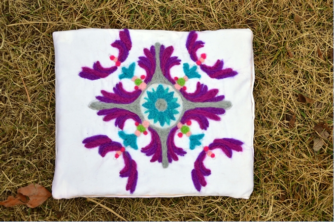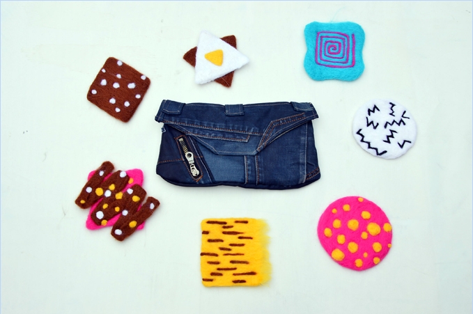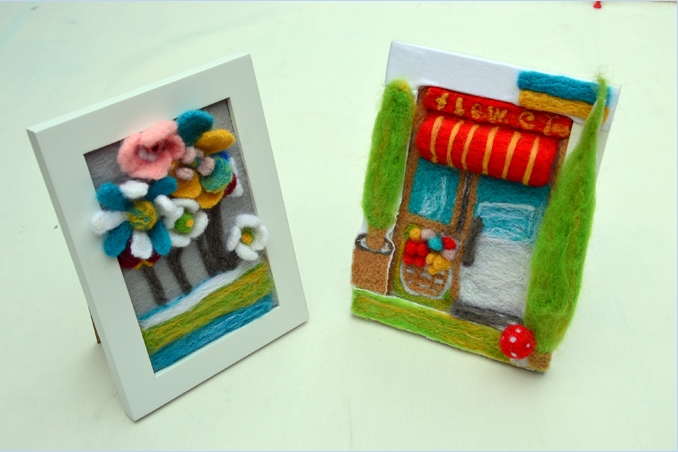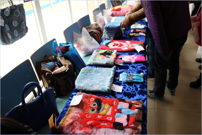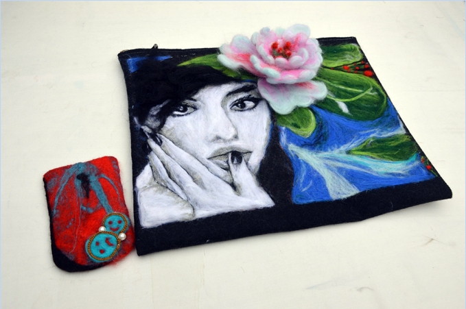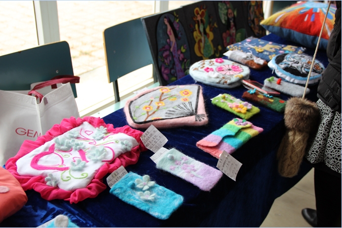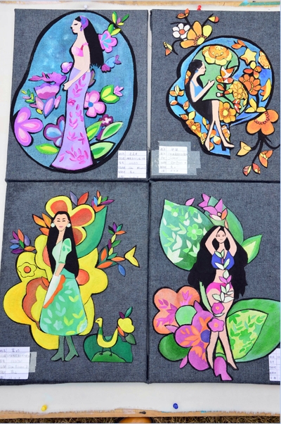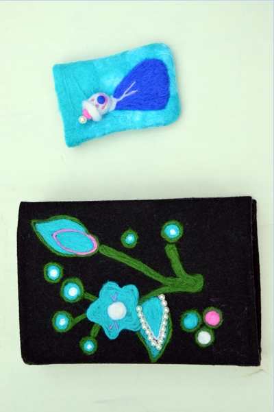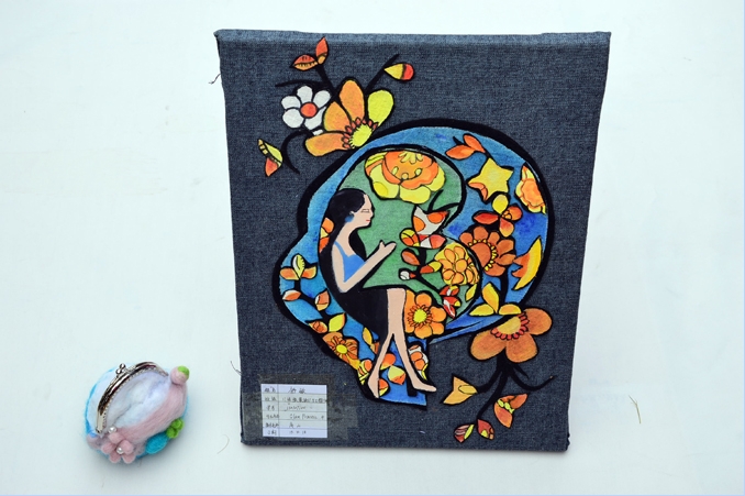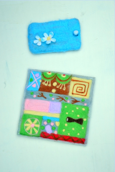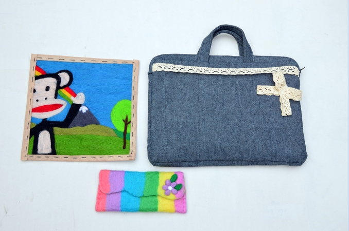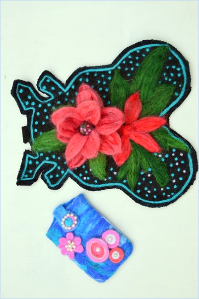 这是学生的服装配套课程的习作展,学生利用服装材料——毛毡,进行服装工艺制作出手机袋,杯垫,背包,抱枕,装饰画布等,样式新颖,颜色搭配亮丽。