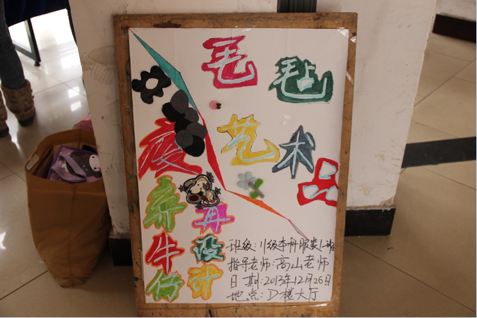 2013年12月25日至26日,在艺术系高山老师的组织下,2011级本科服装班在D楼一楼大厅举办了一场别开生面的作品展,同学们纷纷好奇的走来,被这令郎满目的实物看的眼花缭乱,一个个精致的布艺展现在众人眼前,可以说是一种美的视觉享受。
