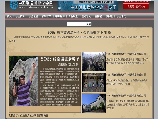 近日我系刘兵生教授的新闻摄影作品《SOS:皖南徽派老房子》在“2013年度全国晚报优秀新闻照片”评选中喜获网络组金奖。