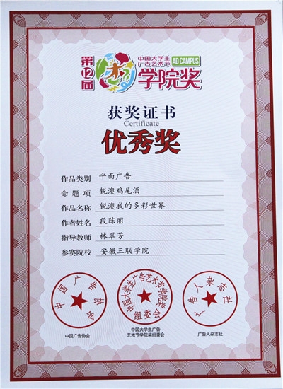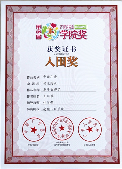 艺术学院硕果累累,捷报频传。在我校艺术学院林翠芳老师指导下,2012级广告设计与制作班的段陈丽,王丽琴、王娟三名同学分别荣获由中国广告协会主办,《广告人》杂志承办的第十二届中国大学生广告艺术节学院奖的优秀奖和入围奖。安徽三联学院被主办方誉为“创意伙伴”。