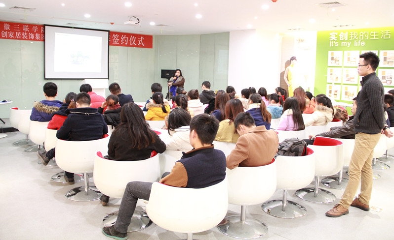 2014年12月16日下午,艺术学院2011级艺术设计专业39名同学在分管院长杨亮和潘玉廉的带队下,一行来到校企合作单位——实创装饰公司,开始“实创班”第一门课程的培训学习。