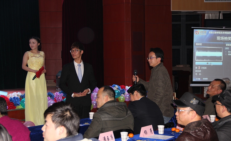 本场晚会,节目形式多样,精彩分呈,展现了艺术学子多才多艺,蓬勃向上和积极进取的精神风貌!中间穿插的赠春联和微博抽奖环节,吸引着欢众们积极参与,台上台下融为一体。最终,来老师带领的手语表演获得一等奖,章老师的双簧表演、符老师歌曲和相声《相亲相爱》获得二等奖,歌剧《枪林弹雨》和《满腹经伦》、爵士舞串烧、till the word ends舞蹈和模特走秀获得三等奖。