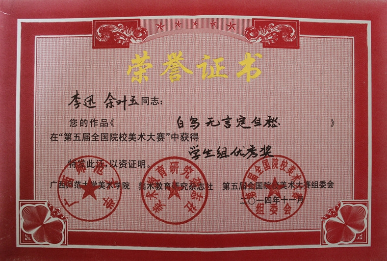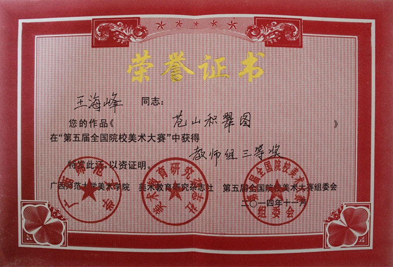 在刚刚落幕的第五届全国院校美术大赛中,我校艺术学院师生作品在大赛中获奖。王海峰老师的作品《苍山积翠图》获教师组三等奖,其辅导的学生李迅、余叶玉(11本动画专业)的作品《白鸟无言定自愁》获学生组优秀奖。