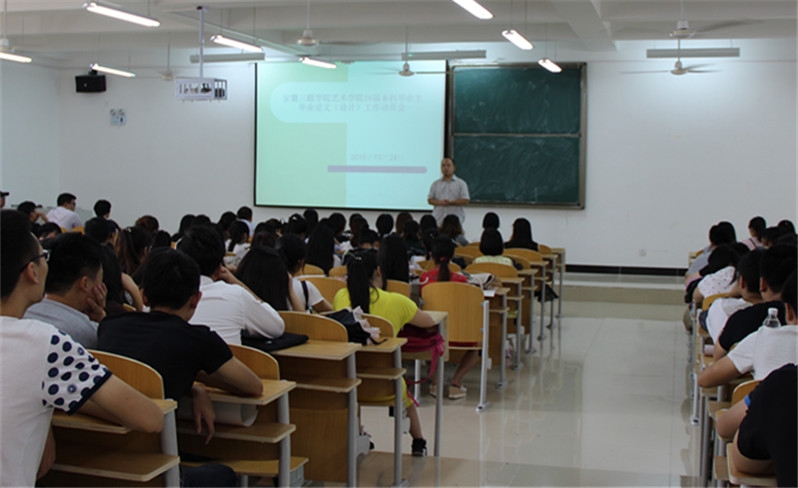 为推动艺术学院2016届本科毕业设计(论文)工作的有序进行,根据本科专业人才培养方案和《安徽三联学院本科毕业论文(设计)工作规程》。2015年9月24日中午在K01多媒体阶梯教室召开艺术学院2016届本科毕业设计(论文)工作动员会。执行院长孙义,副院长周鸣、陶宗华、杨亮、教研室主任、指导教师及2016届全体本科毕业生出席会议。