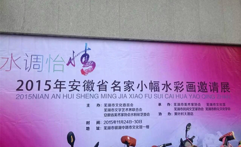 11月24日下午,由安徽省美术家协会水彩粉艺委会和芜湖市文联、美协联合举办的“2015《水调怡情》”安徽名家小幅水彩邀请展在芜湖市文化馆开幕。中国美协理事,省美协主席张松。中国美协水彩艺委会委员,省美协副主席丁寺钟。省青年美协主席陈飞翔,以及芜湖市文联美协领导参加了开幕式。