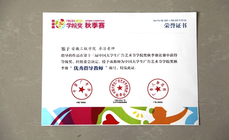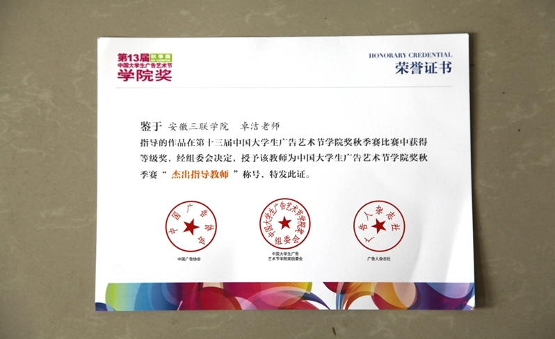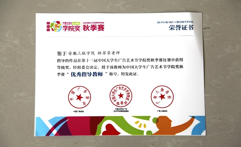 3月21日,第13届中国大学生广告艺术节学院奖秋季赛颁奖典礼在北京梅地亚中心举行。我院学子孙婉秋、吴怀蒙、张芳、刘永梅,金晴晴五位同学的三件作品在90191件参赛作品中脱颖而出,获得佳作奖。林翠芳、卓杰两位老师获“杰出指导教师”和“优秀指导教师”的称号。