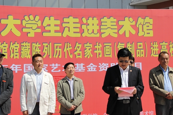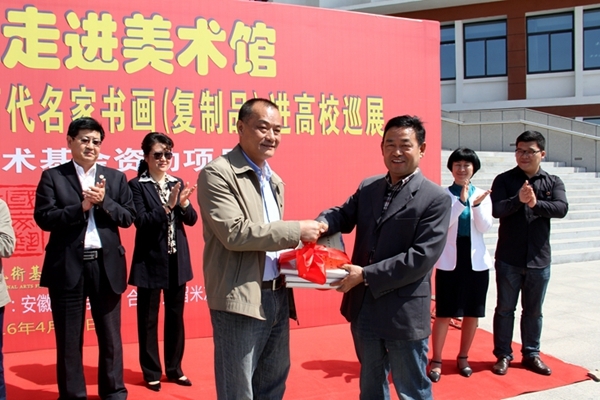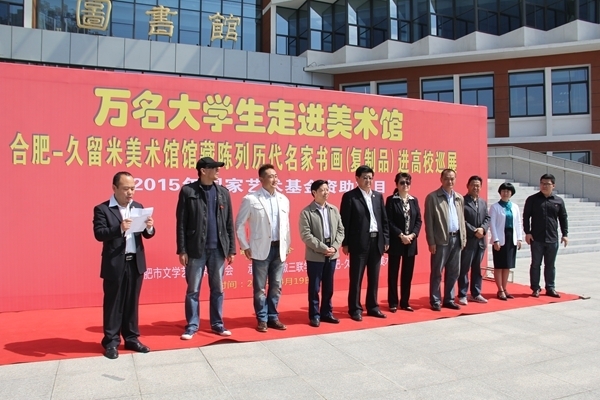 4月19日,由合肥市文联主办,合肥•久留米友好美术馆承办的“万名大学生走进美术馆——合肥•久留米美术馆馆藏陈列历代名家书画(复制品)进高校巡展”活动走进我校并成功开幕。合肥市文联副主席高惠、安徽省美术理论研究会会长陈祥明、合肥•久留米友好美术馆馆长吴蒙,校领导鲁先长、金哲,艺术学院领导及师生代表参加开幕式。合肥市文联副主席高惠女士和校党委副书记鲁先长先生先后致辞,随后艺术学院汪和平院长代表学校接受久留米友好美术馆的图书捐赠。