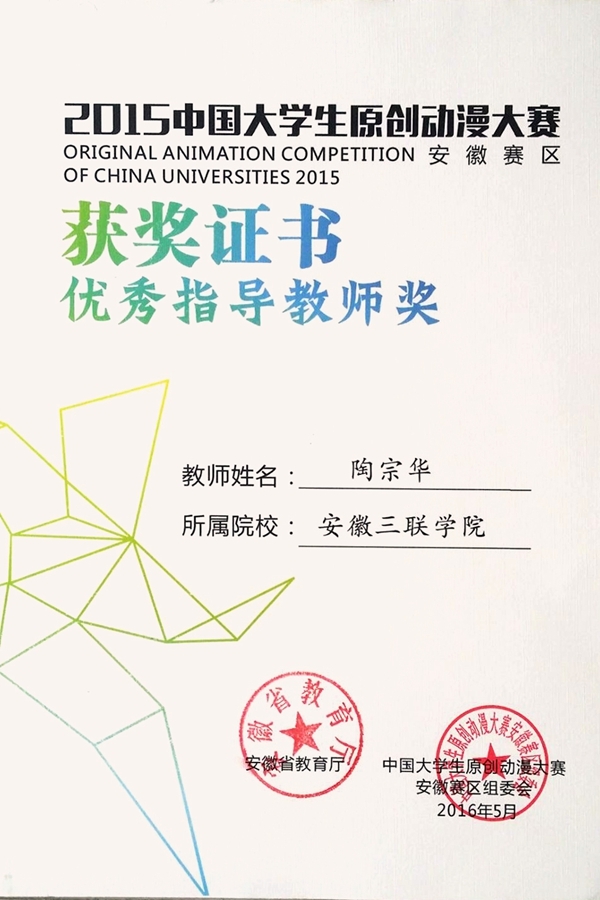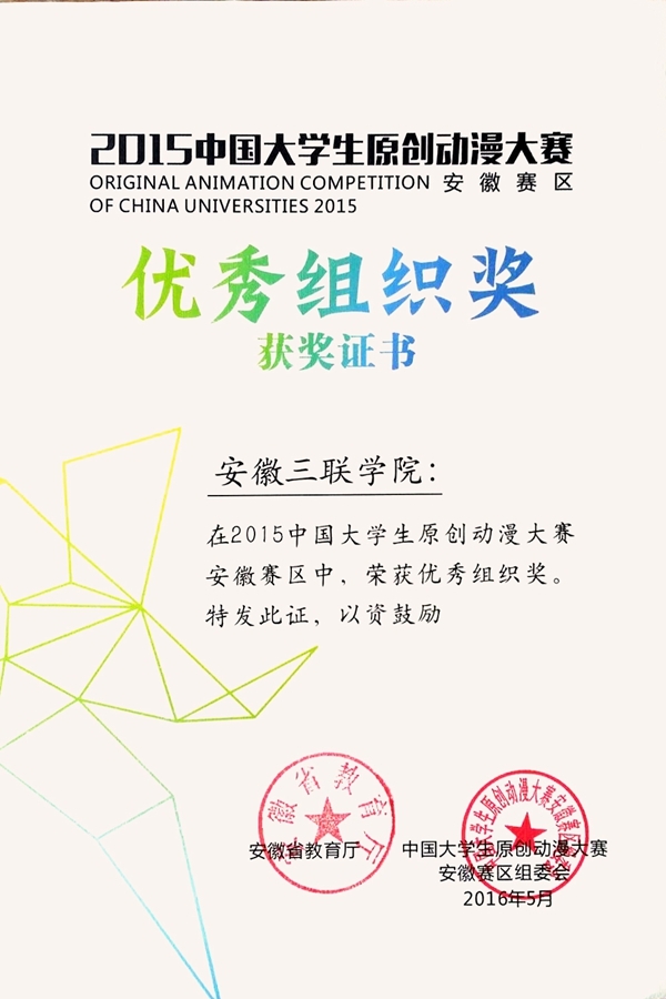 6月10日, 获悉2015中国大学生原创动漫大赛安徽省级赛组委会公布获奖结果。本赛事是由教育部、文化部共同主办,省级赛由省教育厅主办,安徽工程大学承办。大赛旨在挖掘和培养高素质动漫人才,推动我国动漫产业快速发展。
