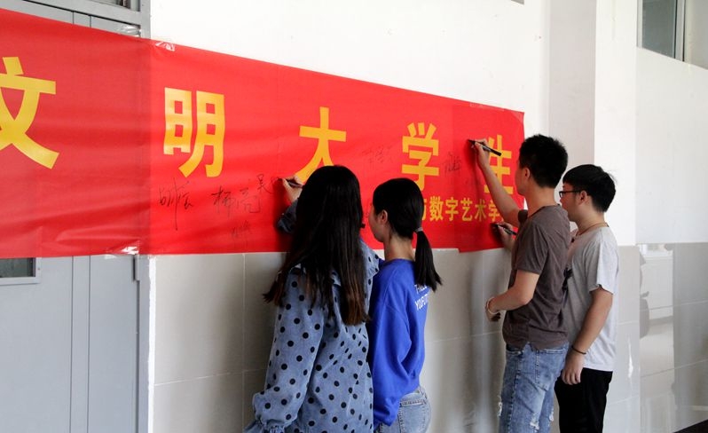 首先学管副院长唐雪莹宣读并带领同学们学习了院学字【2019】9号文件精神,结合学院特色布置了我院开展“大学生校园文明行为养成教育”的活动安排,随后执行院长孙义发表了讲话,要求同学们遵守课堂纪律,做到上课不迟到、不旷课、不早退,举止文明着装大方。自觉遵守宿舍文明,保持宿舍整洁规范,自觉抵制网络低俗不正之风,文明上网。最后孙义院长宣布启动仪式开始,会后所有参加活动人员在宣传横幅上进行了签名合影留念。