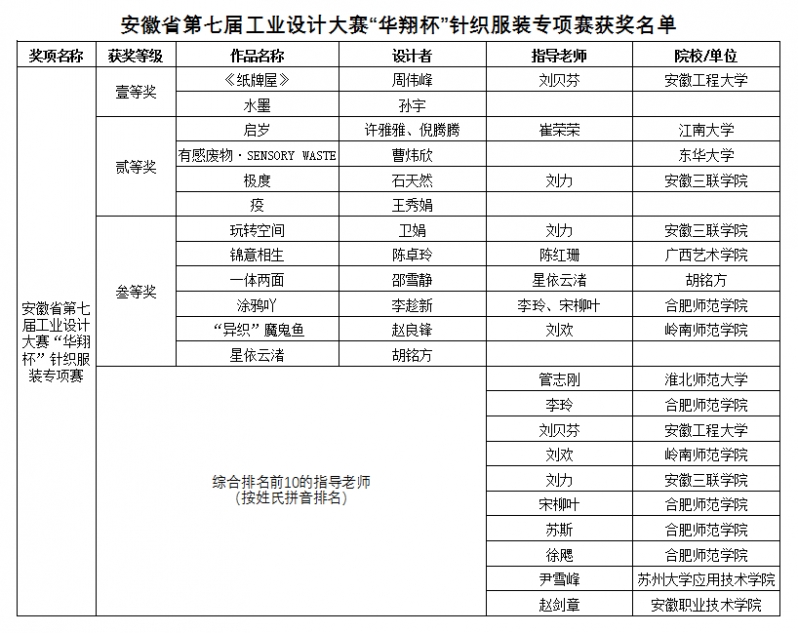 安徽省第七届工业设计大赛“华翔杯”针织服装专项赛是经安徽省经济和信息化厅批准,由上海华翔羊毛衫有限公司全资子公司阜南华翔羊毛衫有限公司主办、安徽宜飞思工业设计有限公司承办面向全国高校的针织服装设计比赛,本届比赛吸引了省内外众多高校参加,评审标准坚持以设计服务产业为基础,并兼顾鼓励设计师的创新。作为一项全国性赛事,大赛以促进培养高校学生的实践能力、创新精神和团队意识为目标,引领工业设计教育发展趋势,设计作品可直接转变为市场方产品,在以赛促教、产业融合等方面发挥了积极作用。