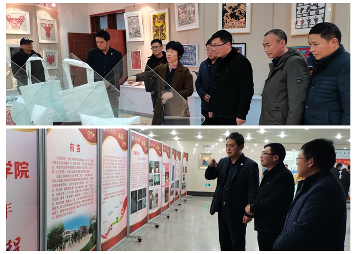 洽谈会结束后,姜发根带领客人参观了学校20周年校庆图文展和剪纸艺术研究中心。