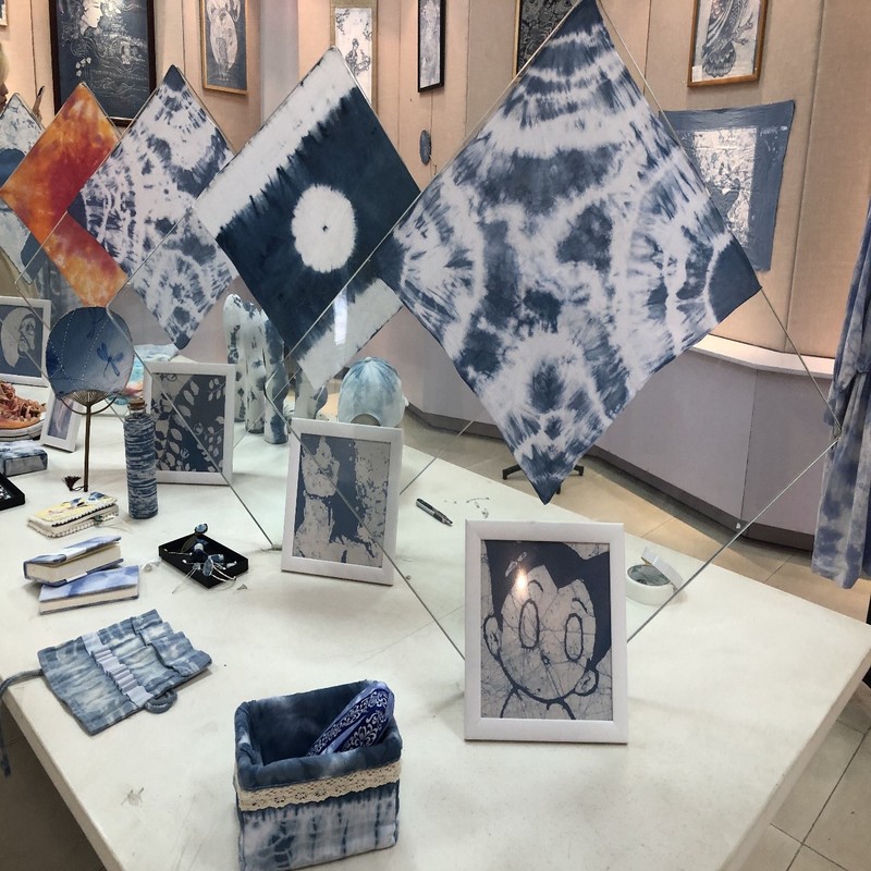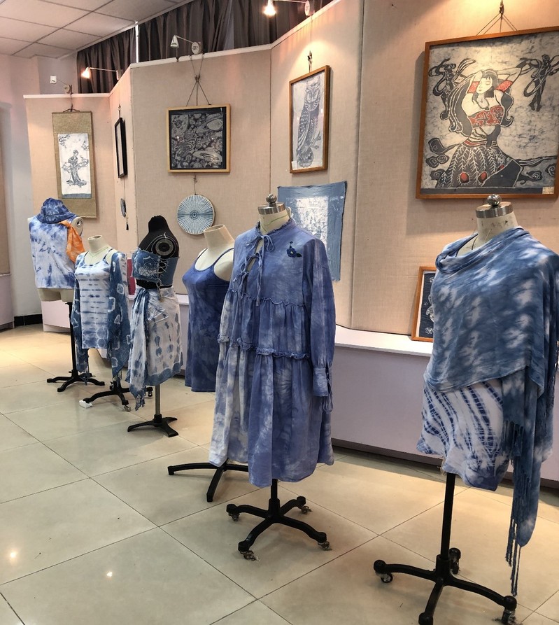 展览作品出自19级服装与服饰设计班的《印染艺术》课程,34名同学展示了自己设计的纯手工作品,作品主要用到了蜡染和印染的技法,同时附有每件作品的灵感来源介绍。在《印染艺术》课程中同学们学习了云染、竖条纹、波浪纹、斜纹理等印染手法,以及流传至今发源于自我国古代少数民族地区的蜡染技法,并在课堂上通过手工画图、上蜡、植物染料浸泡、煮蜡去蜡等繁琐的工作流程,重现了这一传统技艺。从展地布置到作品的摆放都展现了此次展览的独特之处与同学们对此次展览的积极投入。
